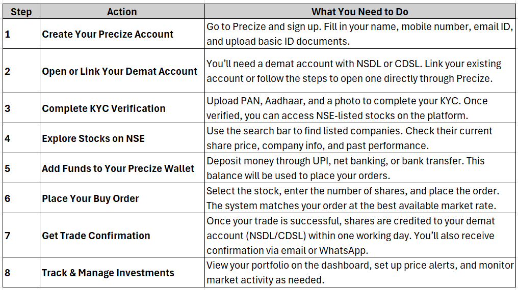Starting your journey with the NSE is straightforward, especially when using online platforms like Precize, which make the entire process easy, safe, and hassle-free. The table below explains each step clearly.
