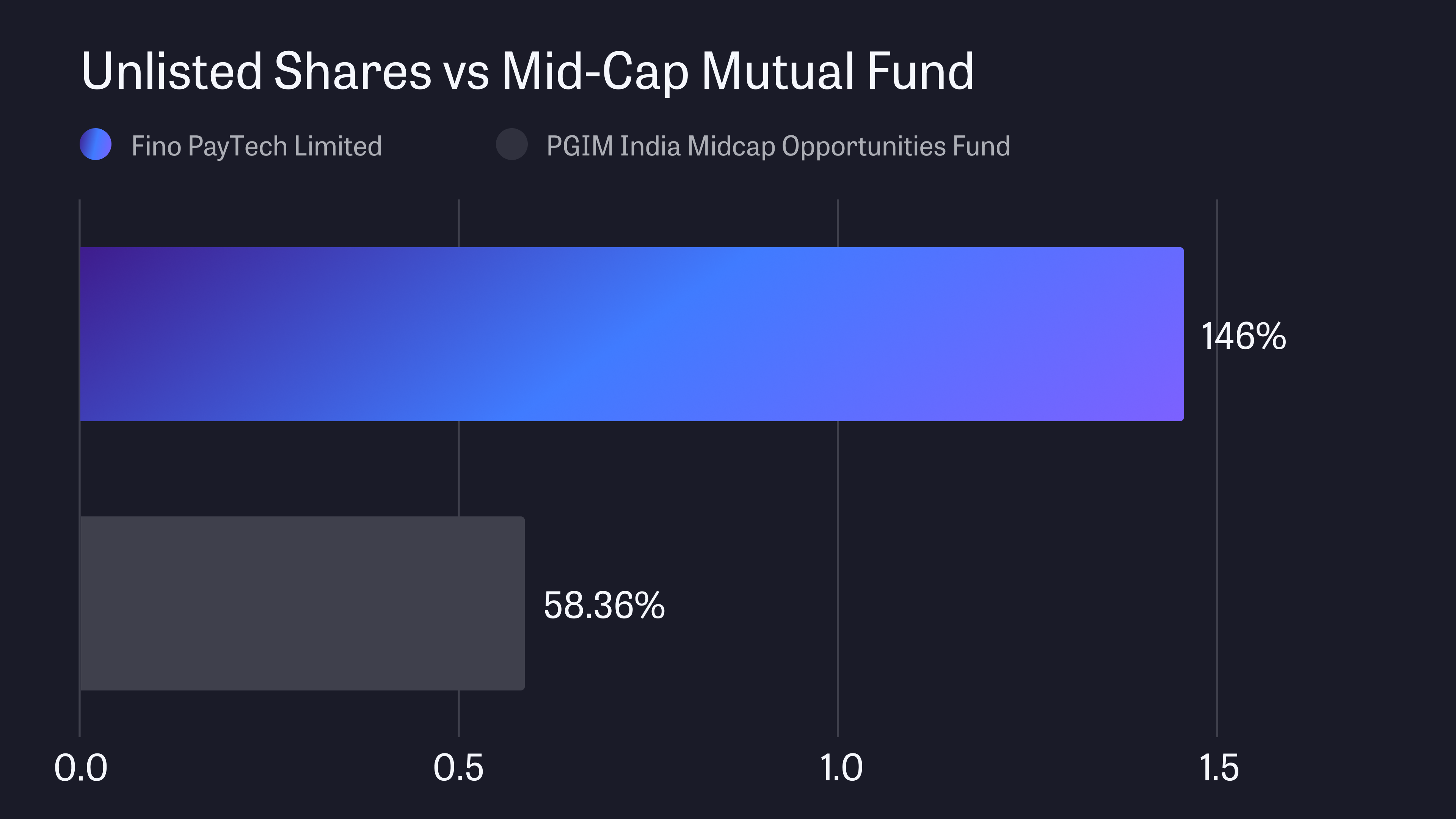 PGIM India Midcap Opportunities Fund is one of the best mid-cap mutual funds, generating returns of 58.36% within a year. However, this wasn't enough to sweep and make unlisted shares weep. I might sound influenced while saying this, but 'Unlisted Shares are superlatively superior!" Look at returns from an Indian high-growth unlisted company, Fino Paytech Limited. The unlisted shares were trading at INR 120 in January last year. Within the next 12 months, the unlisted equities of Fino PayTech were available at 295%. A mammoth spike of 146%!