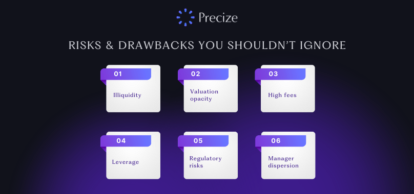 Semi-liquid funds let you take out money more often than hedge funds, but they still carry risks like market swings, valuation issues, and limits on withdrawals.