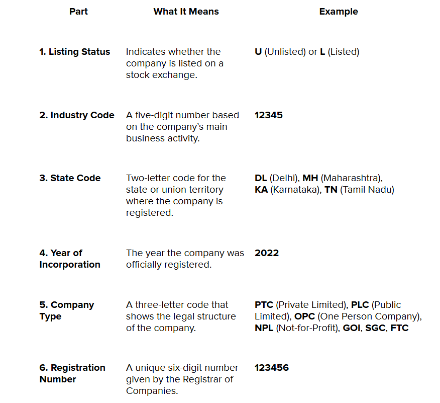 CIN reveals key details like listing status, industry type, registration state, incorporation year, and company structure.