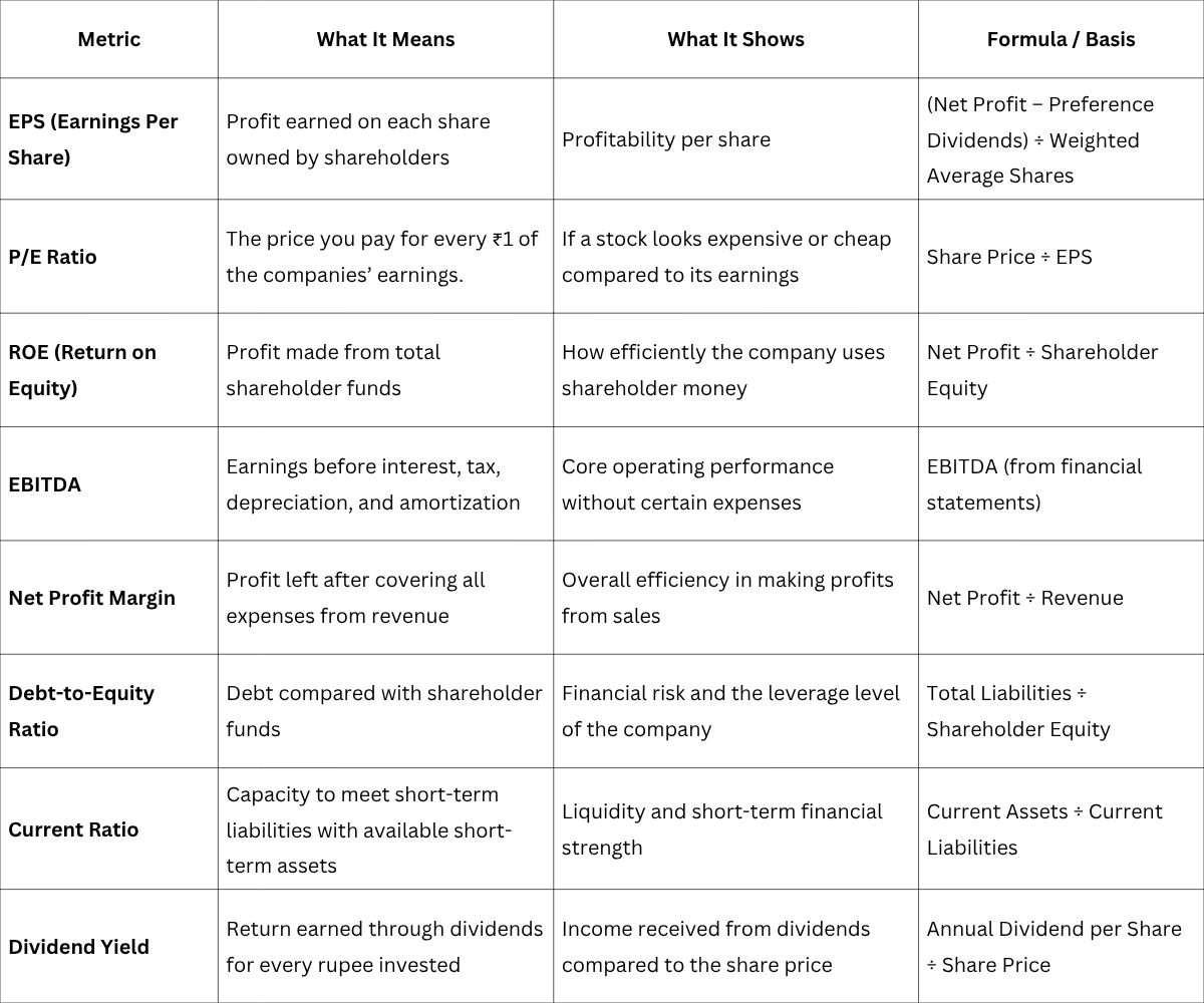 When you study a company’s performance, EPS alone doesn’t give the full picture. It needs to be looked at alongside other financial metrics that highlight profitability, efficiency, liquidity, and overall financial health. Here is the table that shows how EPS compares with other key metrics: