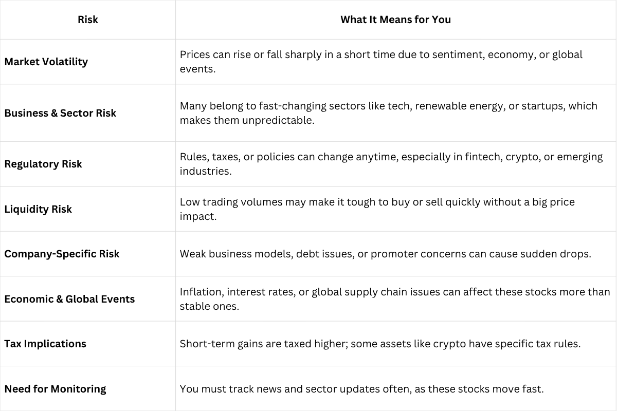 High-risk stocks can be tricky because they move fast and need close tracking. If you’re just starting, it’s better to focus on stable options and slowly learn how to handle market ups and downs.