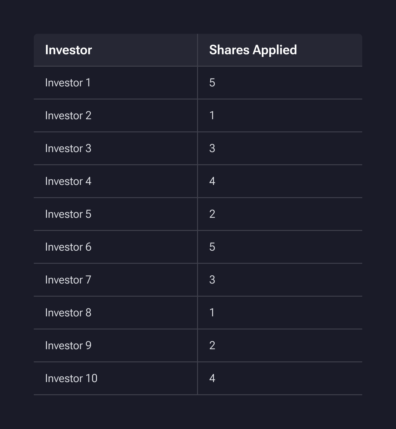 Assume that 10 retail investors have applied for an IPO at the cut-off price, which is the price at which shares are issued. Each investor has placed a bid ranging from 1 to 5 shares. The list of investors and their bids might look like this: