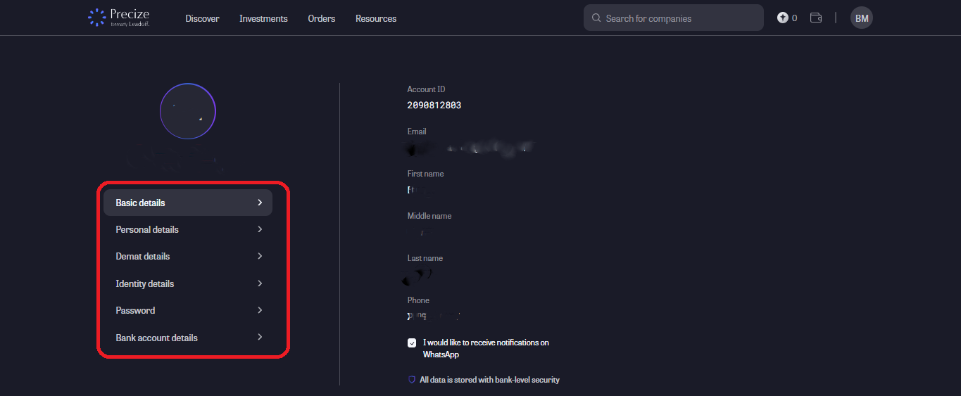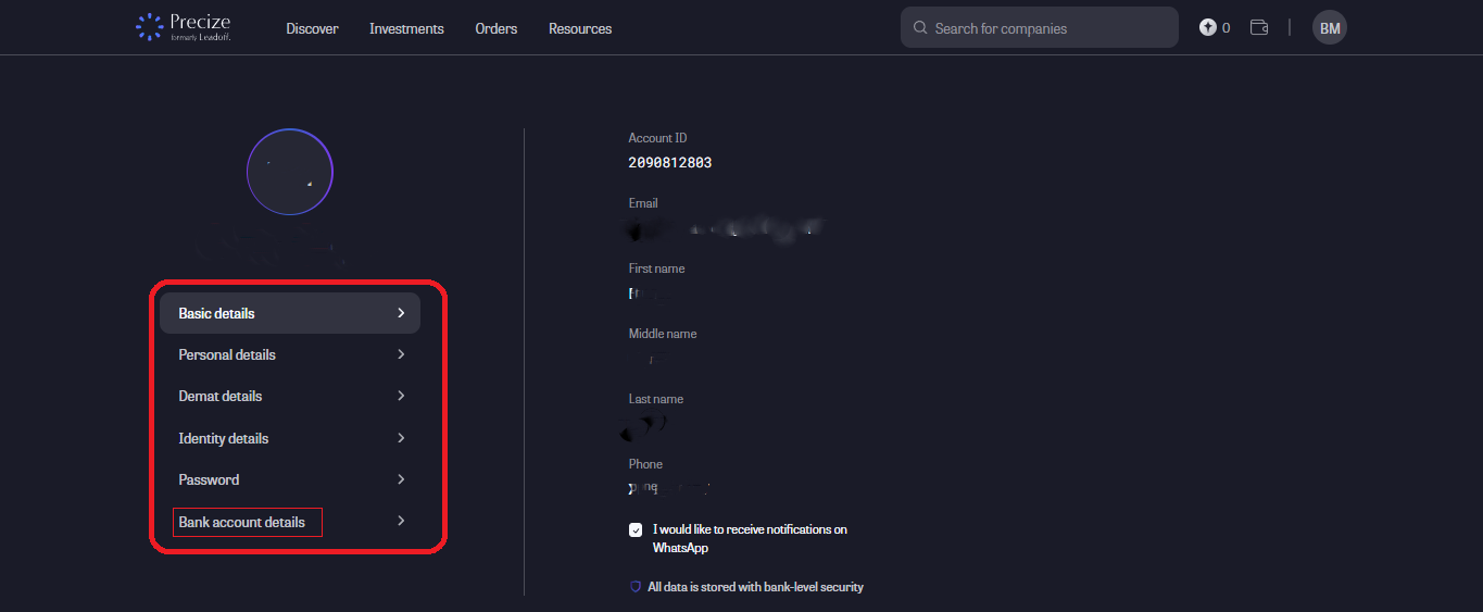 Bank Account Details: These details are necessary for Precize to credit the sale proceeds directly into your bank account when you sell your shares through Precize.