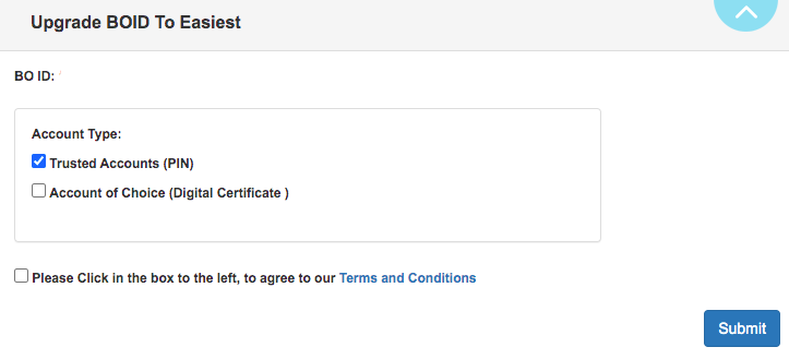 Step 3. Choose "Trusted account (PIN)" as the Account Type, agree to the terms and conditions, and click "Submit."
