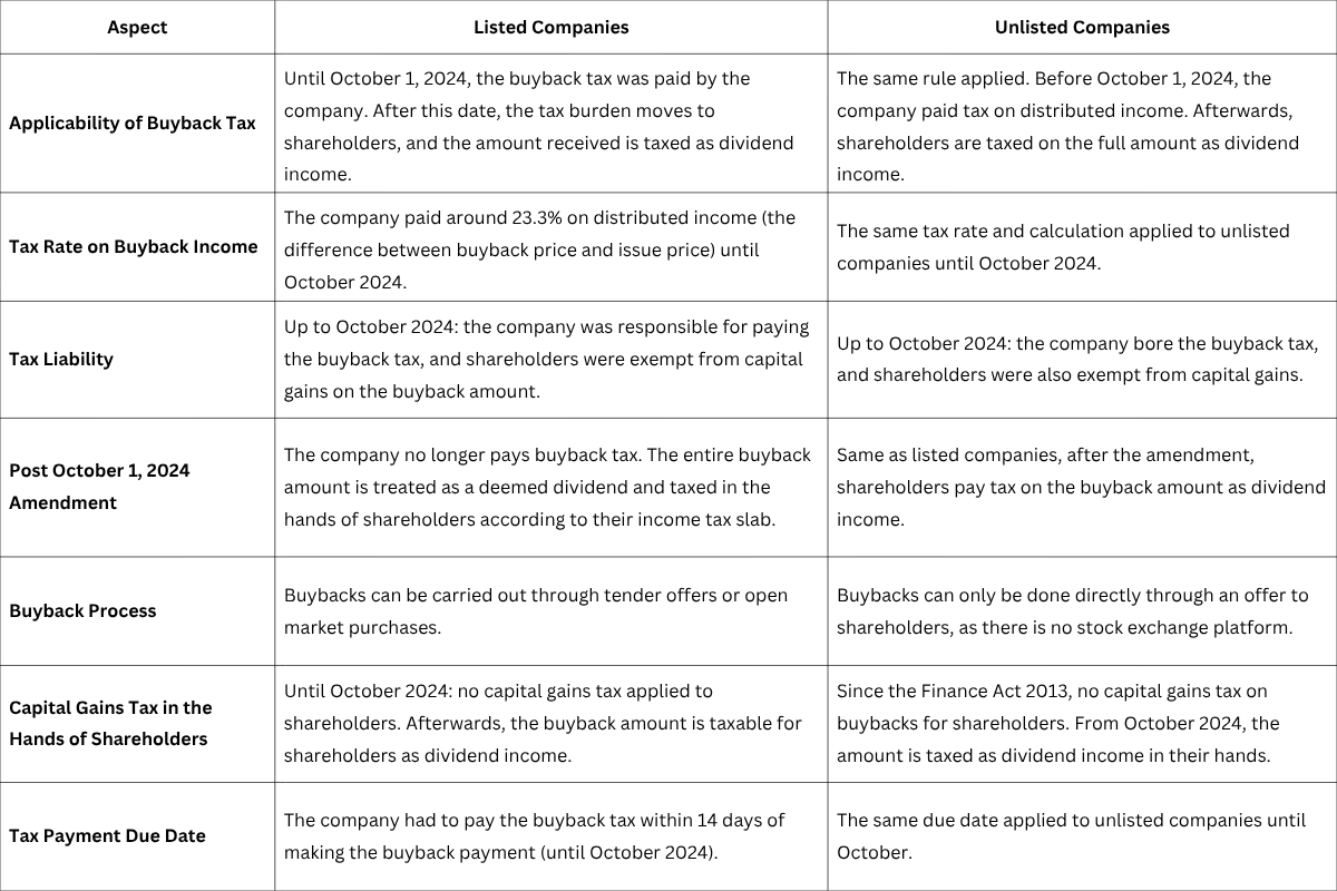 The way the buyback tax is applied is not the same for listed and unlisted companies, though after October 1, 2024, both follow a similar rule where the tax liability shifts to shareholders. Here is how the treatment differs: