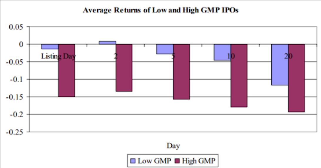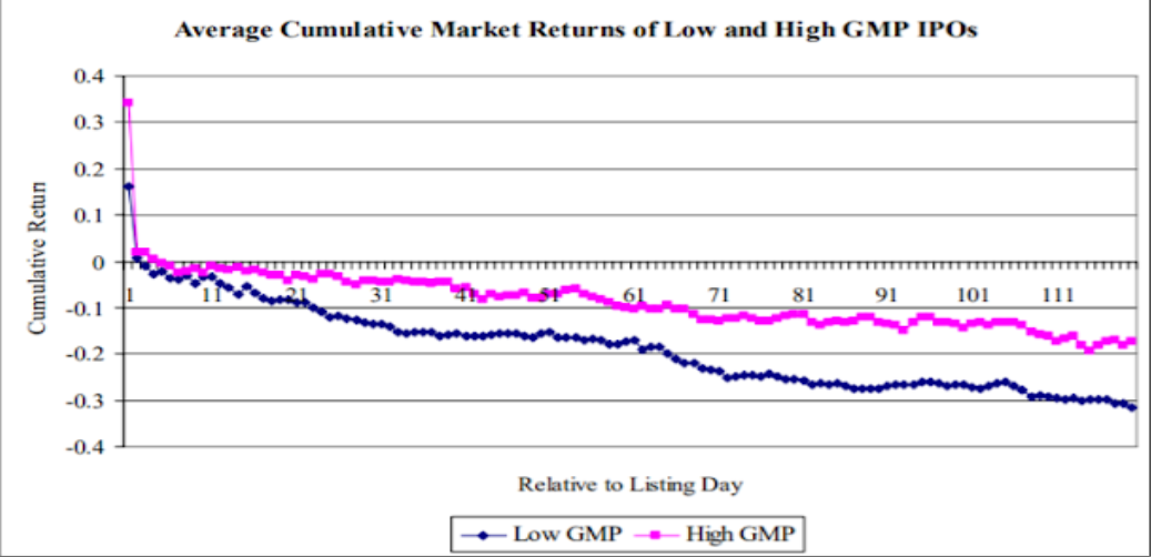 For low GMP firms, on the other hand, we find that the first correction is less severe, but the price reversal is significantly steeper after that. While high Grey Market Prices are suggestive of a majority of subjectivity traders, they may also confirm the existence of professional investors ready to capitalize on investor irrationality, according to our findings.