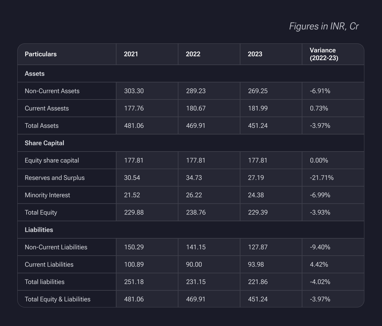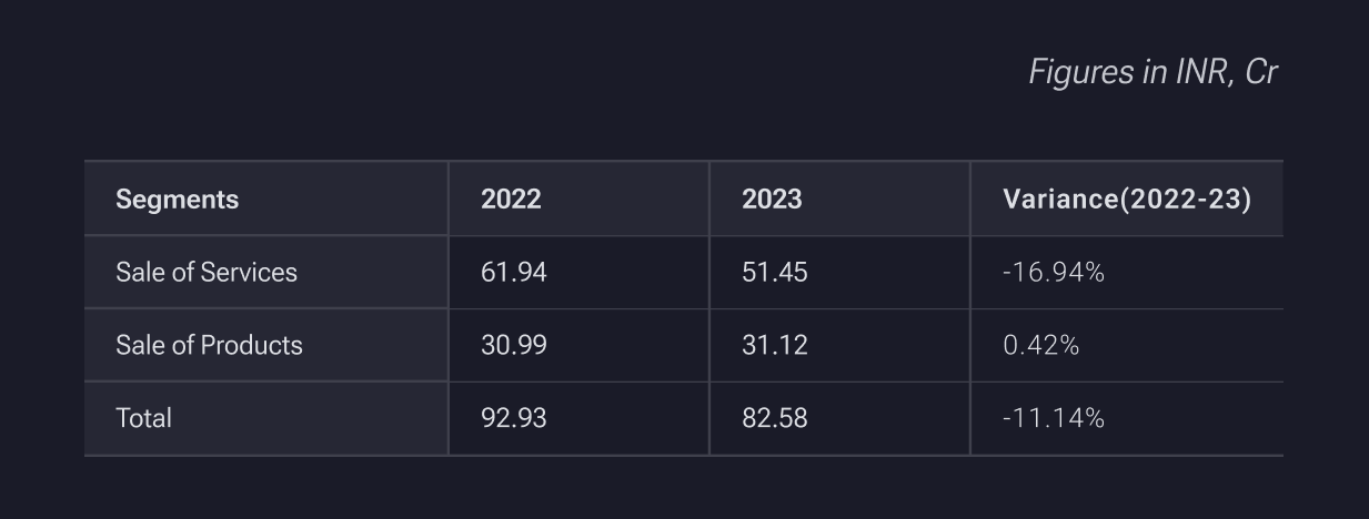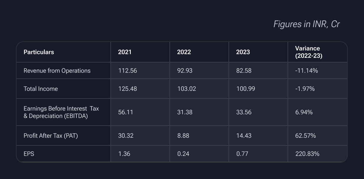 The company experienced a significant increase in Profit After Tax (PAT) by 83.21% for the financial year 2022-23, primarily attributed to higher interest earned. However, Revenue from Operations (RFO) witnessed a decrease of 11.14% in the calendar year, amounting to Rs. 82.58 Crores compared to the previous year's Rs. 92.93 Crores. This decline in RFO was primarily due to reduced revenue generated from the sale of services (including construction income, income from disposal of land & building, and Lighting system commissioning services) and products (such as the sale of lighting system and security system) during the period.