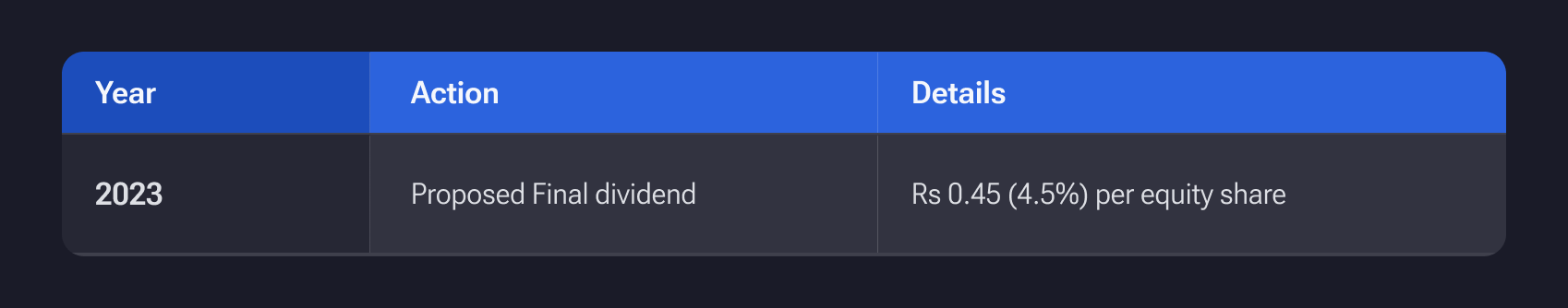 In 2023, Inkel Unlisted Shares announced a proposed final dividend of Rs. 0.45 (4.5%) per equity share.