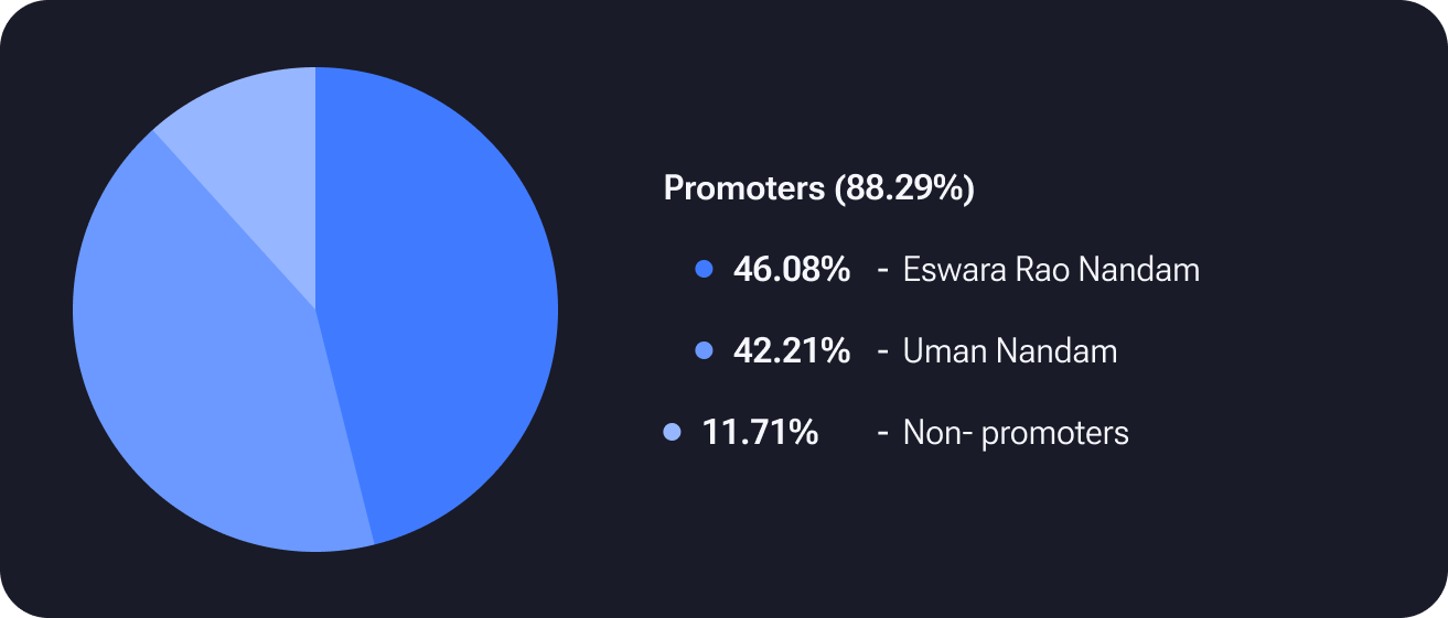 The shareholding structure of Polymatech Electronics reveals that promoters hold a substantial 88.29% of the company's shares. Among the promoters, Eswara Rao Nandam holds a significant 46.08%, while Uman Nandam holds 42.20%. Non-promoters account for the remaining 11.71% of the shareholding. This distribution highlights a dominant presence of promoters in the ownership structure, with a clear majority stake in the company.