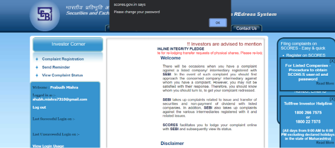 1. When an investor re-visits the SCORES web portal and logs in with the ‘Login ID’ & ‘First time Password’ mentioned in the email, the following message pops up the first time they log in.