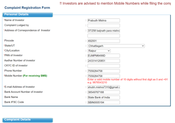 Investors/complainants must supply the following personal information to file a complaint on SCORES: