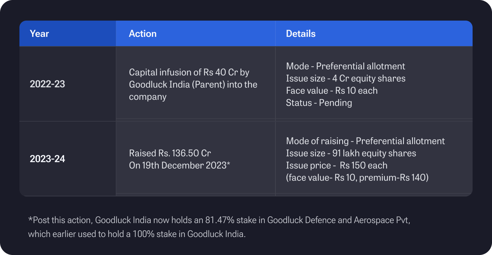In the fiscal year 2022-23, Goodluck India, the parent company, decided to inject Rs 40 Cr into the company via preferential allotment, issuing 4 Cr equity shares valued at Rs 10 each. This transaction is currently pending.