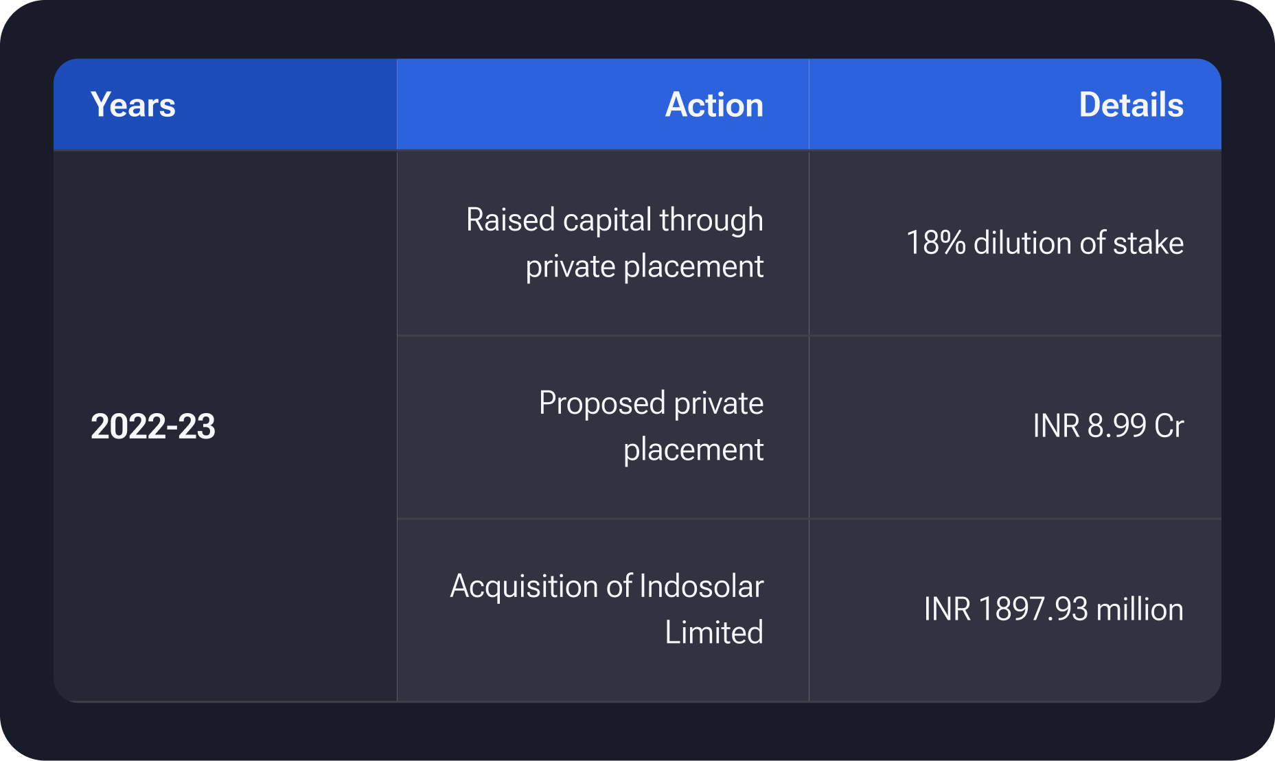 The company raised INR 10,401 Million through a private placement led by ValueQuest. These funds are earmarked for a substantial 6 GW capacity expansion, contributing to India's 12 GW solar manufacturing capacity. In a separate move, the company plans to allot 163,636 equity shares at Rs 550 each to Quest Portfolio Services Private Limited through a private placement, generating Rs 8.99 crore. This decision, approved on September 2, 2023, aligns with the company's strategic financial moves. Additionally, the company acquired a significant 96.15% stake in IndoSolar Ltd for Rs 1,897.93 million, involving a combination of equity investment and loans. Notably, Rs 400 million was invested in equity, Rs 217.30 million provided as a loan, with the remaining funds to be infused in the fiscal year 2022-23.