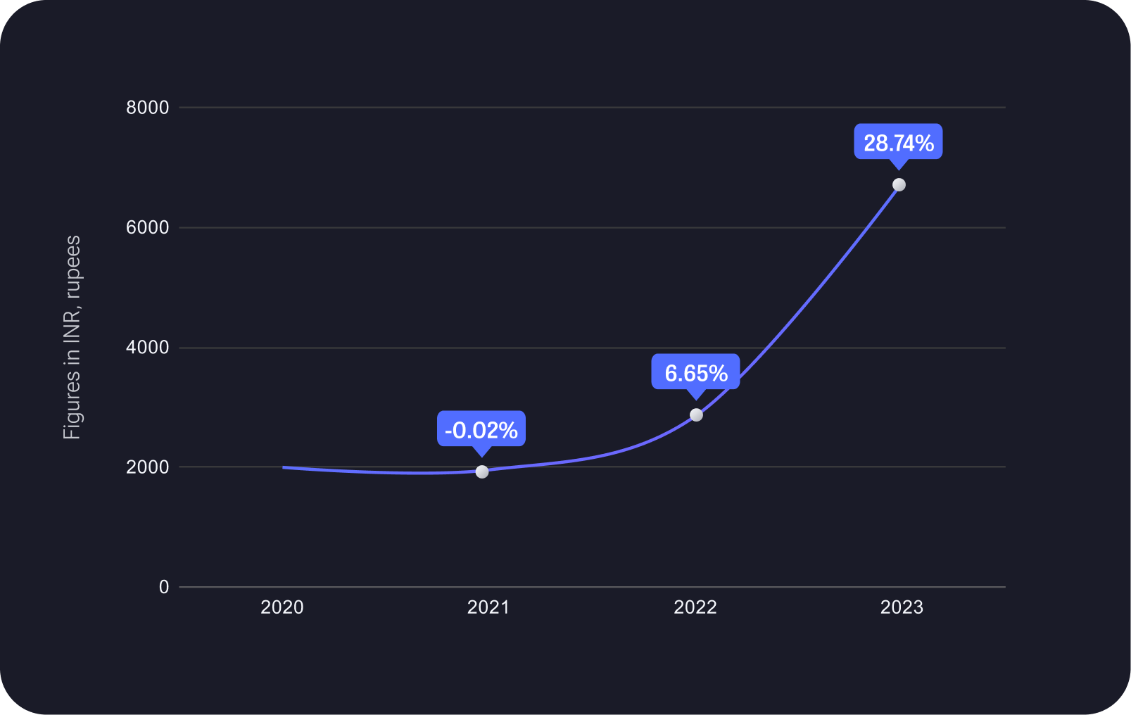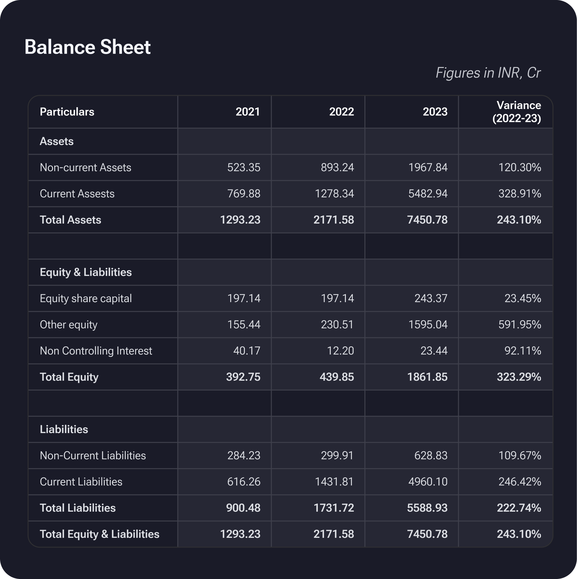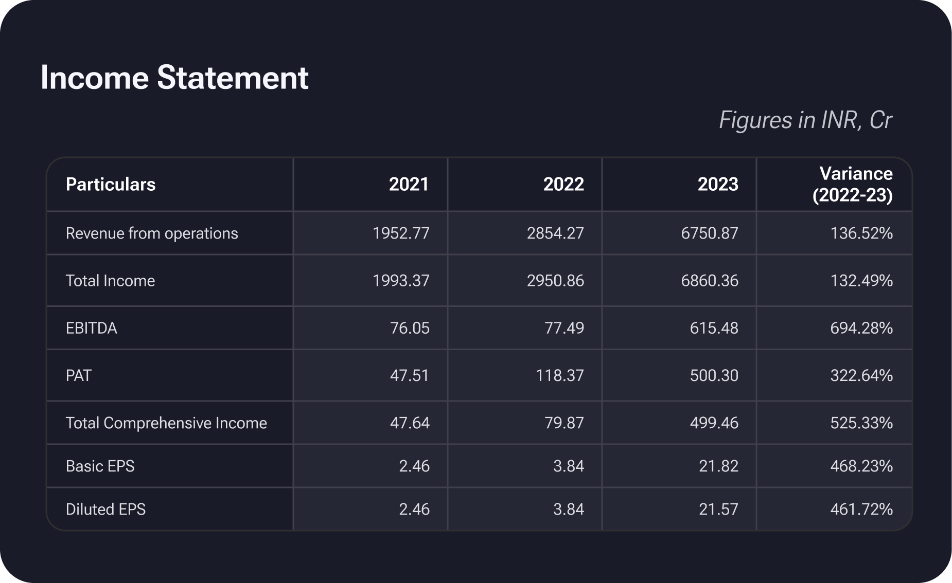 Waaree Energies experienced a consistent increase in annual revenue from 1995.78 Crores in 2020 to a substantial surge of 6750.87 Crores in 2023. The fiscal year 2022 marked a notable upswing, with revenue reaching 2854.2 Crores. This indicates a positive and dynamic growth trajectory for the company over the specified four-year period.