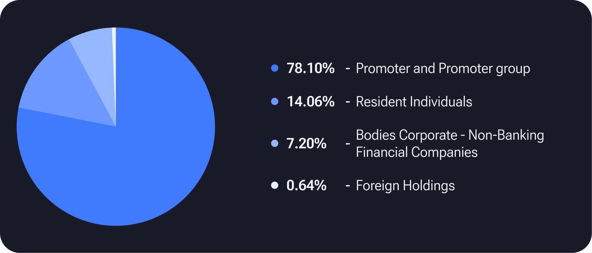 The shareholding structure of the company is categorized as follows: Promoter and Promoter Group hold the majority with 78.10%, reflecting a strong promoter influence. Resident Individuals contribute 14.06%, showcasing participation from individual investors within the country. Foreign Holdings represent 0.64%, indicating a minor international investor presence. Bodies Corporate, particularly Non-Banking Financial Companies (NBFCs), contribute 7.20%, demonstrating institutional involvement. Collectively, this diverse mix forms the total shareholding of the company, reflecting a well-distributed ownership structure with the promoter group clearly prominent.