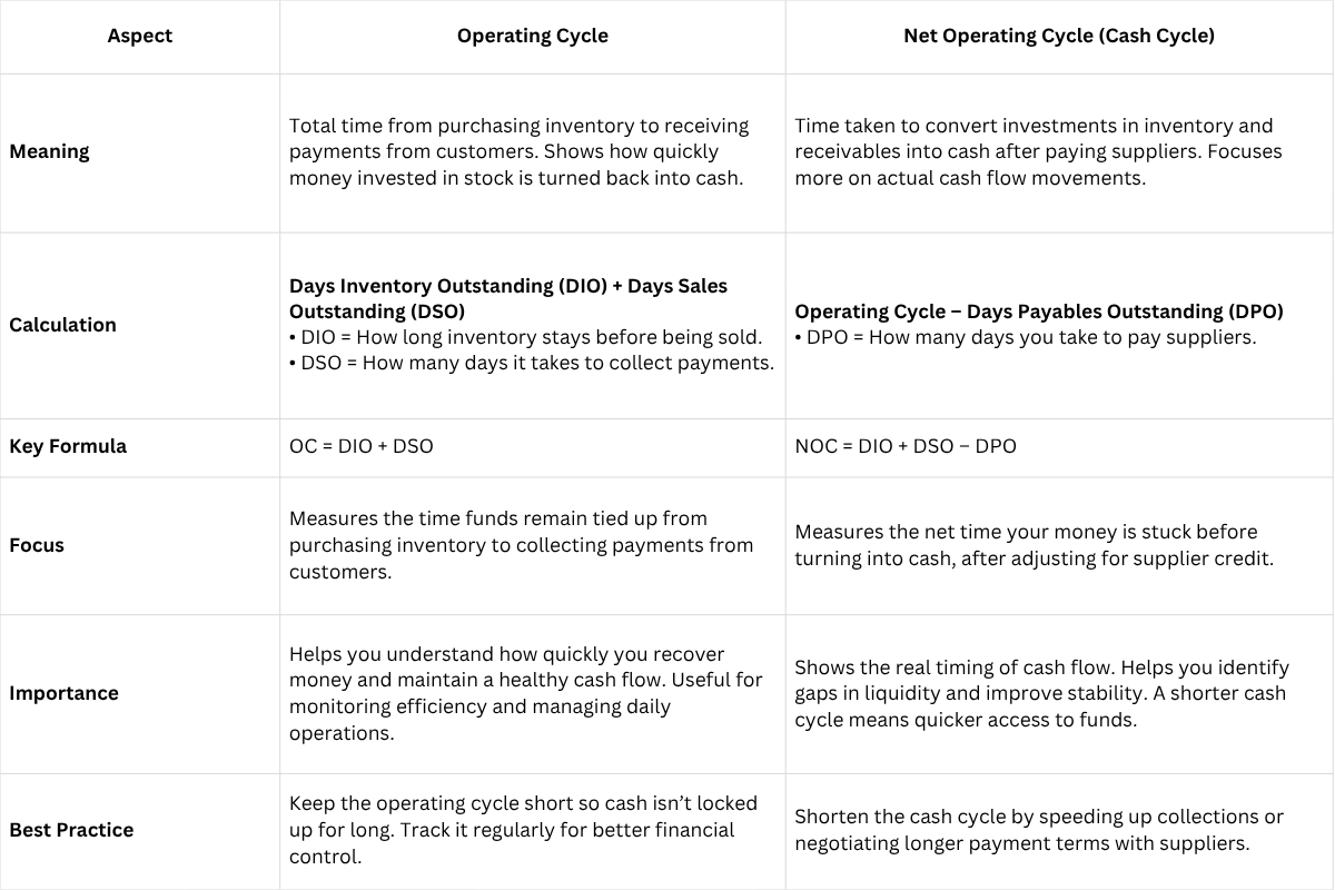 While both terms may sound similar, the operating cycle and the net operating cycle focus on slightly different aspects of cash movement in your business. Comparing them side by side helps you understand not just how money flows in, but also how supplier credit impacts your overall cash position.