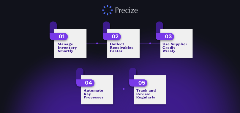 Monitor important metrics such as Days Inventory Outstanding (DIO), Days Sales Outstanding (DSO), and Days Payables Outstanding (DPO). Regularly reviewing these numbers helps you identify gaps and make the necessary adjustments to improve efficiency.