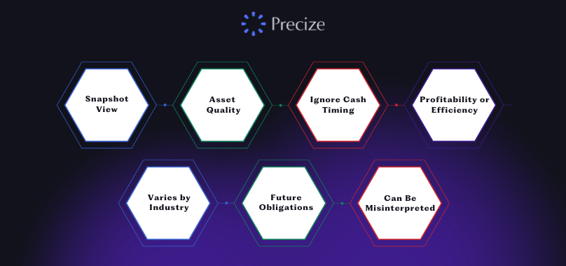Limitations include being a snapshot measure, ignoring asset quality, seasonality, and not reflecting overall profitability or long-term obligations.